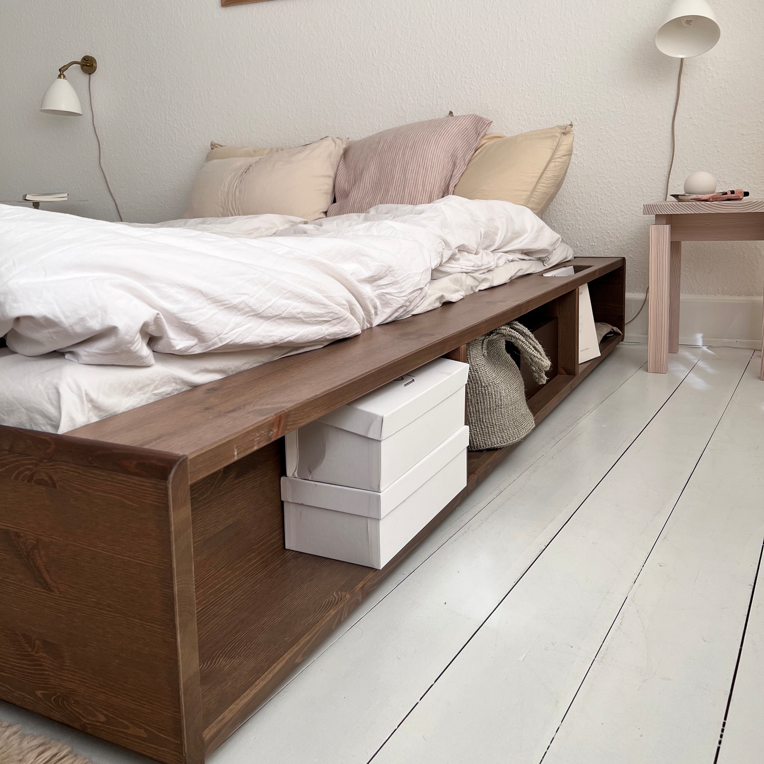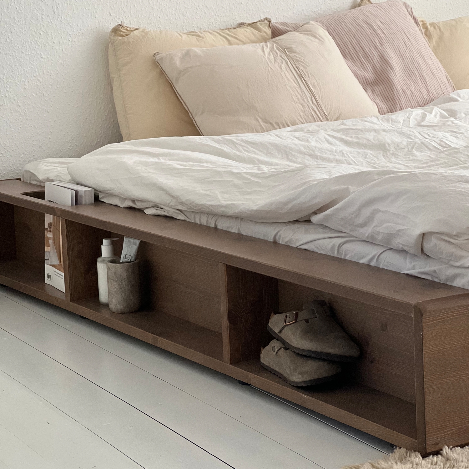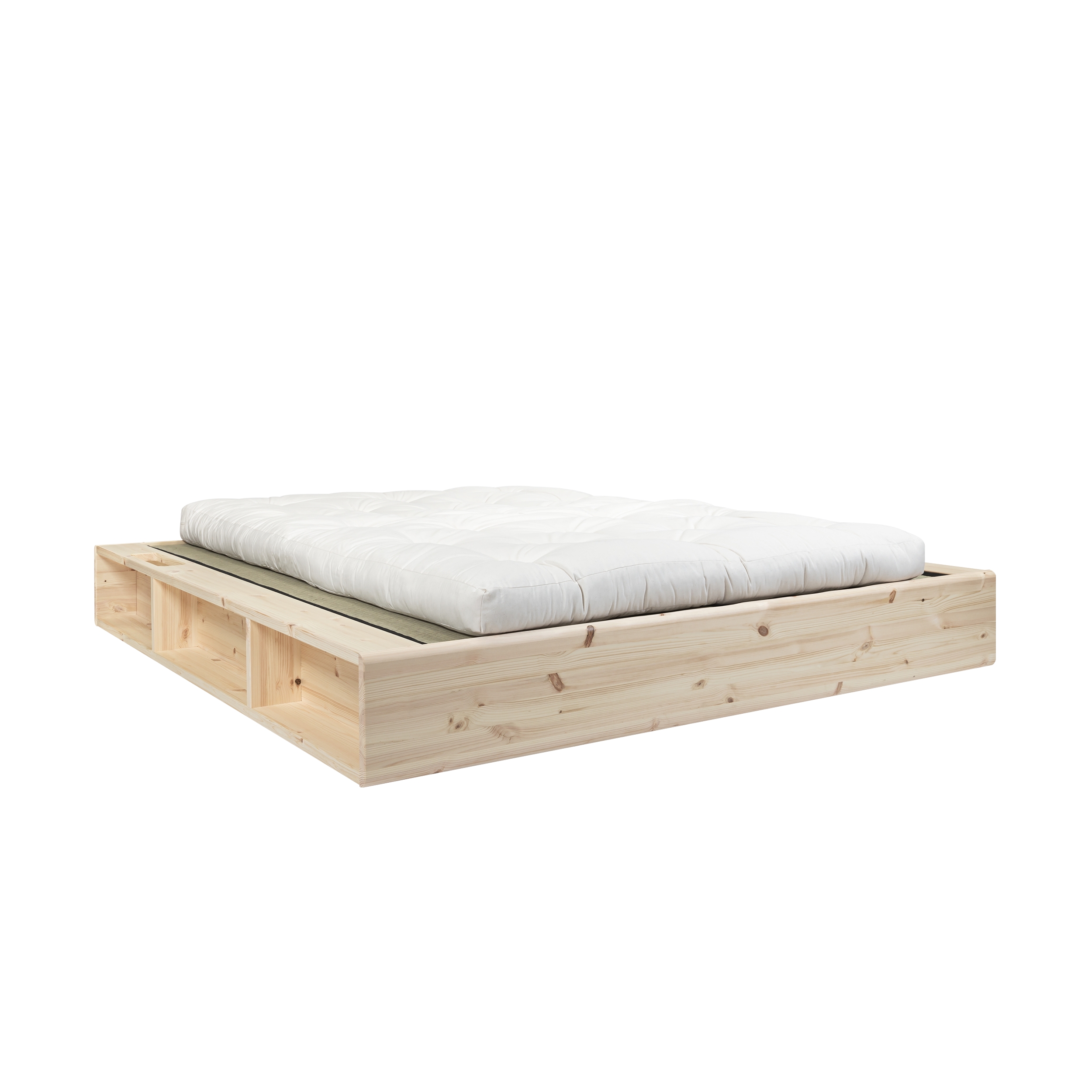 Posteľ a úložný priestor. Ziggy je navrhnutý s veľkým dôrazom na materiály a funkčnosť. Mäkký zakrivený rám postele je vyrobený z masívneho borovicového dreva certifikovaného FSC® a je k dispozícii v prírodnom svetle borovicovom dreve alebo potiahnutý čiernym lakom na vodnej báze, alebo carob. Funkčnosť Ziggy je zabudovaná priamo do rámu, spolu šesť otvorených úložných priestorov, čo umožňuje viac úložného priestoru v menších bytoch alebo domácnostiach. Pre uloženie vašich obľúbených kníh má rám inteligentný bočné vreckový systém. Široký povrch rámu navyše umožňuje ľahké nabíjanie chytrých zariadenia priamo pri posteli a nahrádza nočný stolík. Na rám postele Ziggy možno pridať tatami a vytvoriť tak japonský vzhľad vašej spálne.