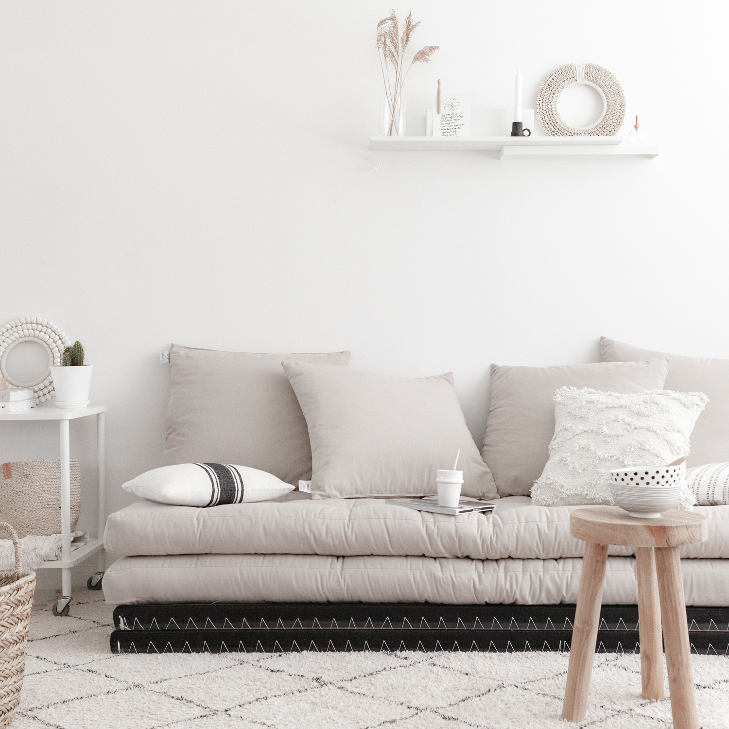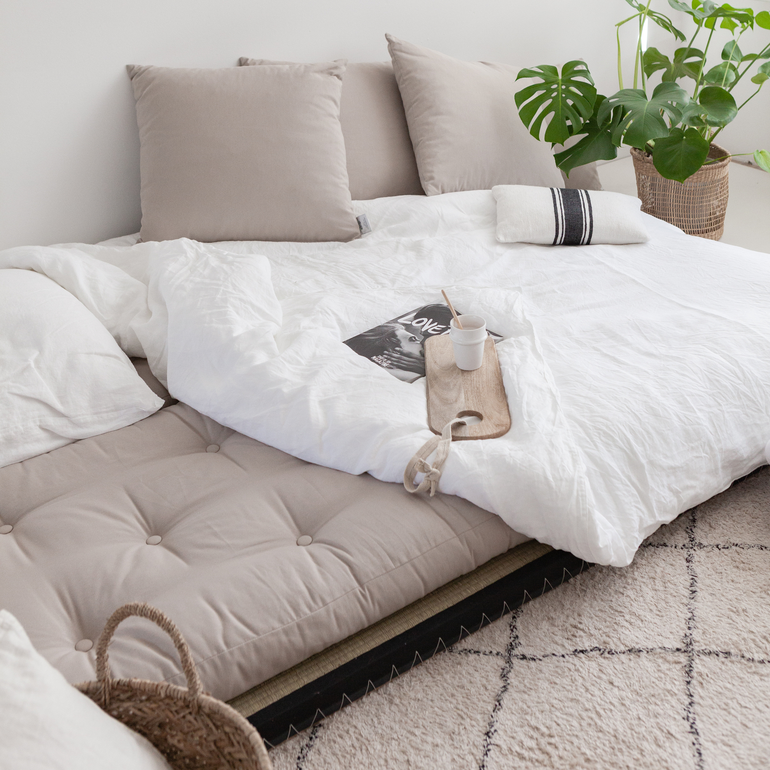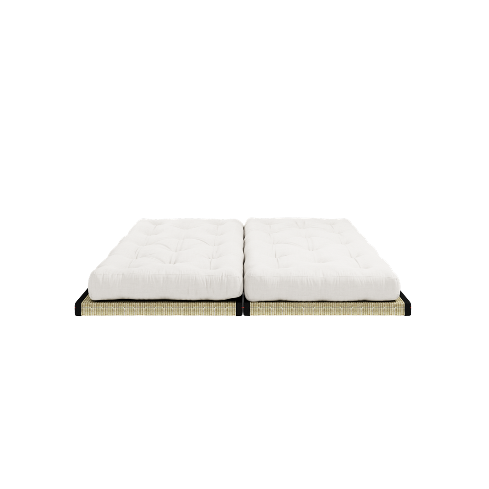 Chico je jedným z našich najzákladnejších a najľahšie použiteľných návrhov, pričom je vysoko prispôsobiteľný vašim meniacim sa potrebám. Chico, vyrobené z iba dvoch podložiek Tatami, dvoch futonových matracov a dvoch sád vankúšov, ľahko mení svoj tvar. Nie sú tu žiadne pánty; v skutočnosti jeho kusy do seba zapadajú bez akéhokoľvek typu spojovacích častí. To znamená, že svoje Chico môžete bez námahy premeniť na sekčné, menšie pohovku a dvojlôžko! Táto jednoduchá, ale účinná pohovka je skvelá pre organizovanie večierkov, relaxáciu a hosťovanie hostí.